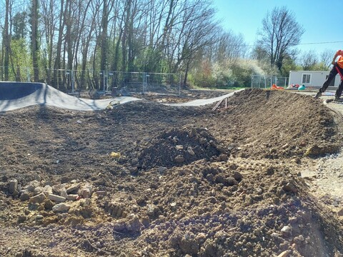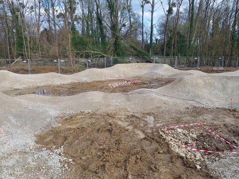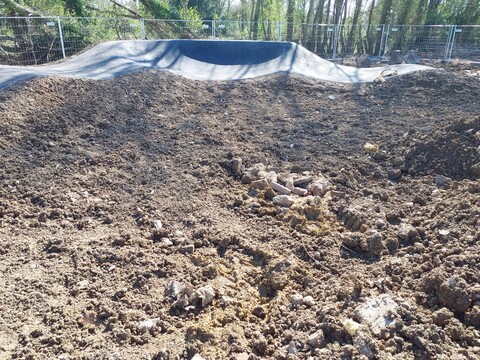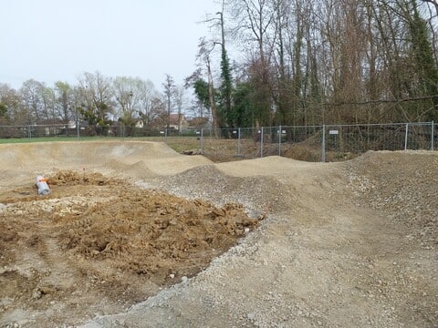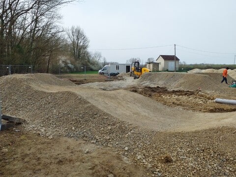 Le modelage du pumptrack est en cours. Les puits d’infiltration des eaux pluviales ont été creusés pour drainer le terrain et infiltrer les eaux pluviales de surfaces. Les bosses seront ensuite recouvertes d’une couche d’enrobé.